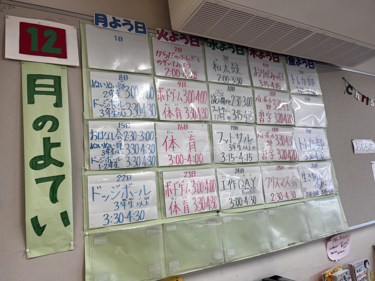 活動の場では、子どもたちが安心して参加できるよう工夫を随所に施す。例えば、入り口を入ってすぐの黒板には時計、絵カード、大きな文字のスケジュールを貼り出している。1年生や文字が苦手な児童にも分かりやすいよう、イラスト入りで表示している。