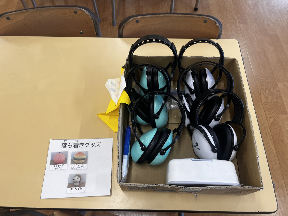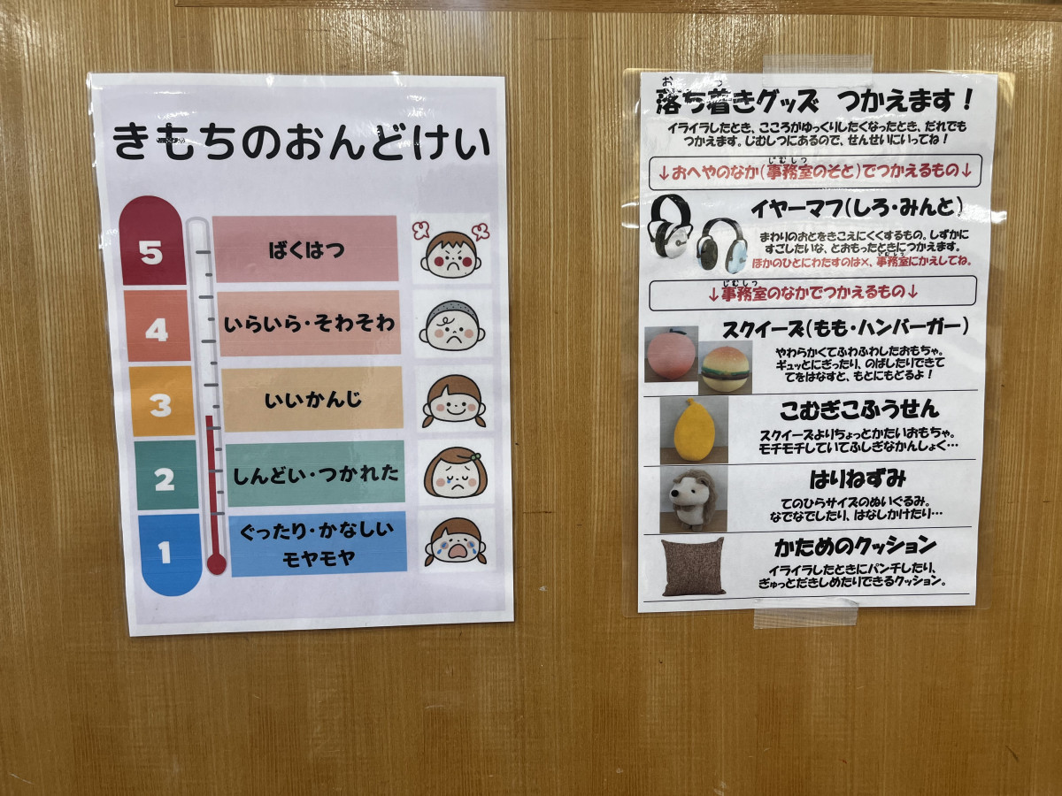 その下には、「気持ちの温度計」のポスターがあり、気持ちの言語化をサポート。感情が爆発しそうな時や、うまく言葉で説明できない時に活用されているという。その近くには、センサリートイやイヤーマフを置き、感覚に過敏さがあっても外部からの刺激を和らげて落ち着きたい時に使えるようになっている。