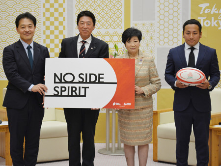 ラグビーの2035年ワールドカップ開催地に立候補した日本協会の土田雅人会長(左から2人目)が6日、東京都庁で小池百合子都知事(右から2人目)を表敬訪問した。元日本代表の流大(右端)も同席。 【時事通信社】