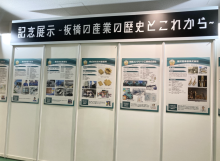 板橋区は江戸時代、中山道の板橋宿や川越街道の上板橋宿が置かれ発展していった地域。さらに荒川や新河岸川の水運にも恵まれたことで、交通と物流の要として発展してきた。1876(明治9)年には加賀に火薬製造工場が設立され、これを起点に光学兵器などの軍需産業が形成されていった。戦後は平和産業へと転換が進み、金属加工、光学、精密機器、印刷関連など、多様な産業が区内で発展。記念展示として、区内で長く操業している企業・団体について産業の歴史を交えながら展示した。