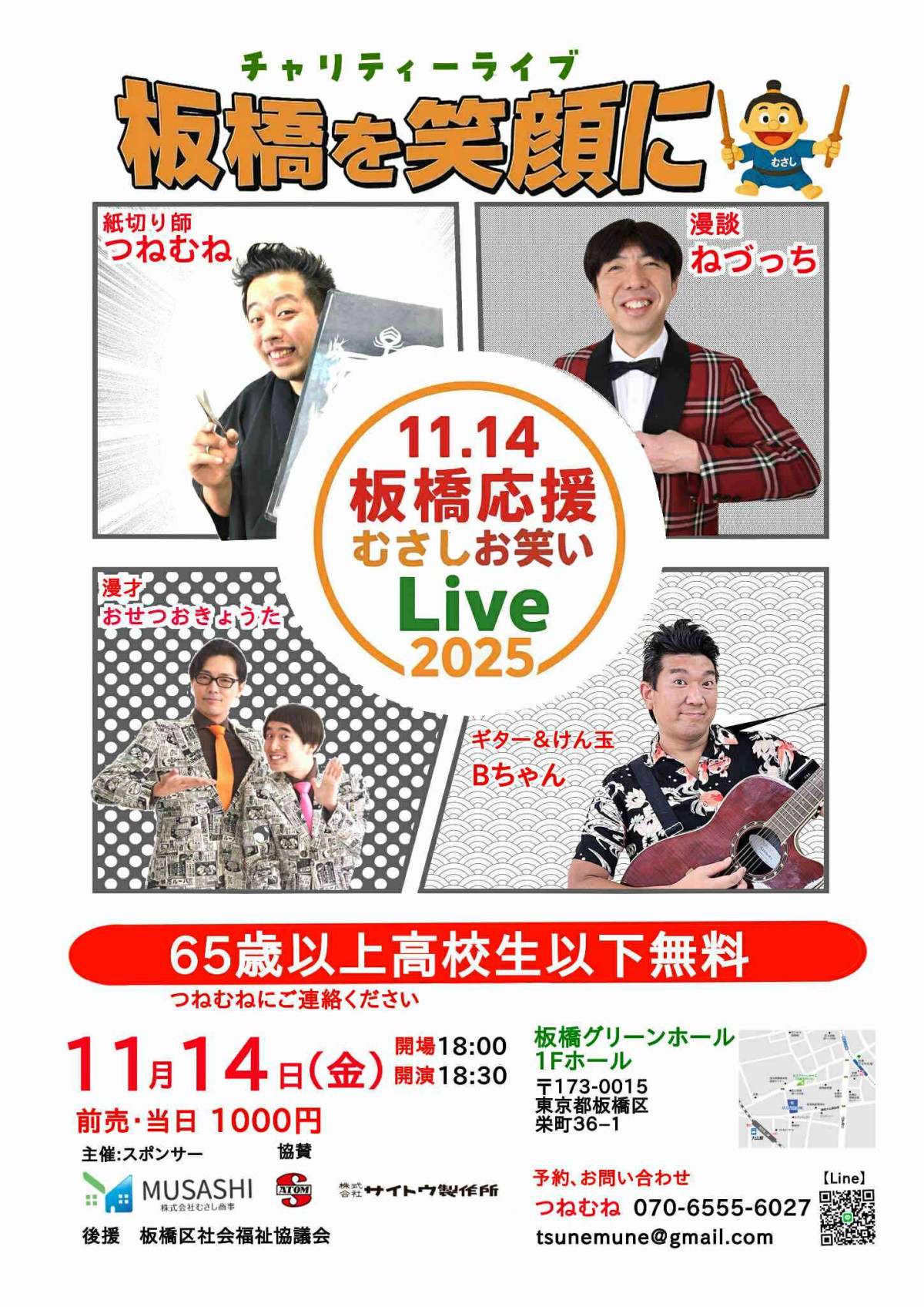 グリーンホールでチャリティーお笑いライブ つねむねさん・ねづっちさん出演