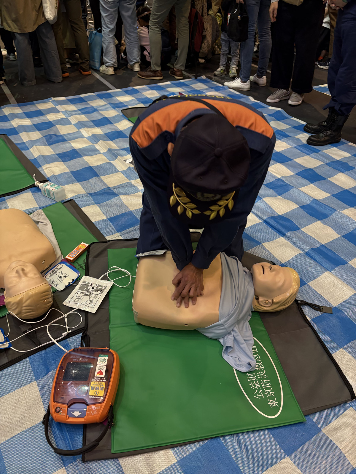AED体験のデモンストレーション。来場者も実際の装置を使って体験