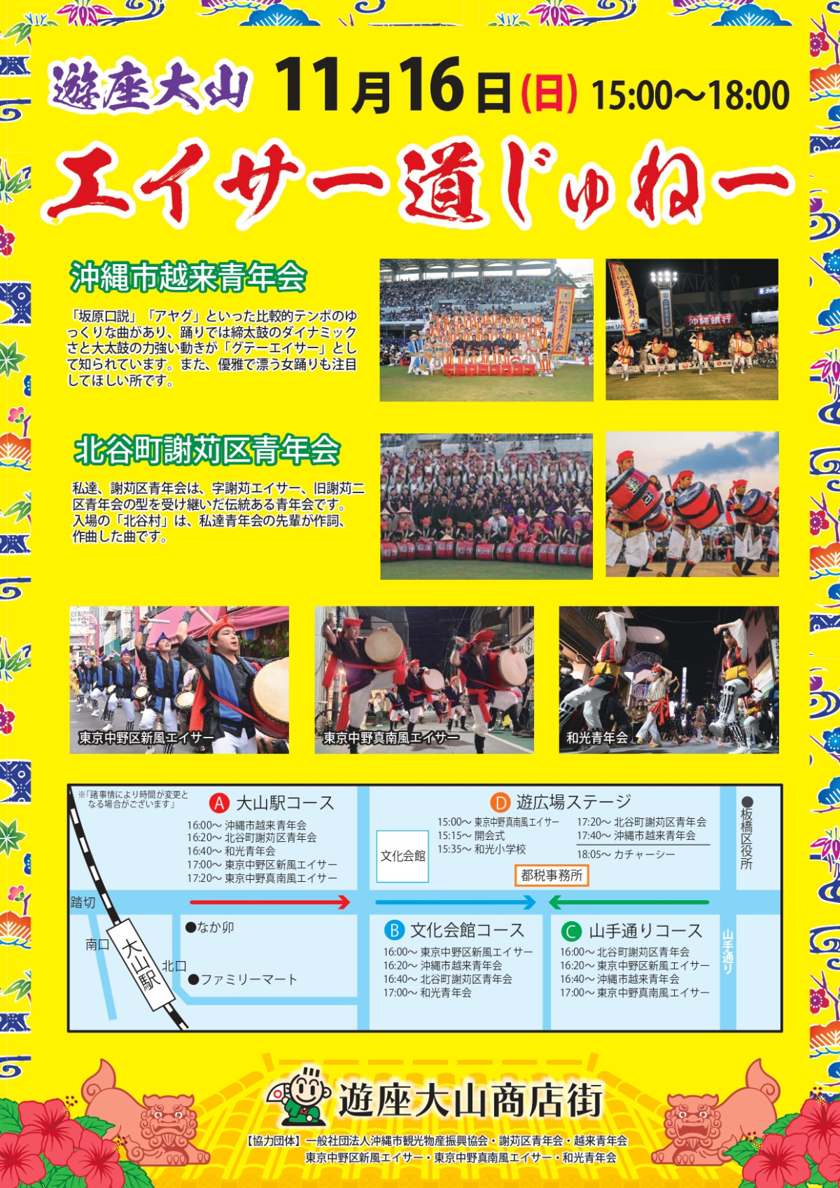 沖縄県の伝統芸能のエイサーが練り歩く「遊座大山エイサー道じゅね~」が11月16日、遊座大山商店街(板橋区大山東町)で開催される。