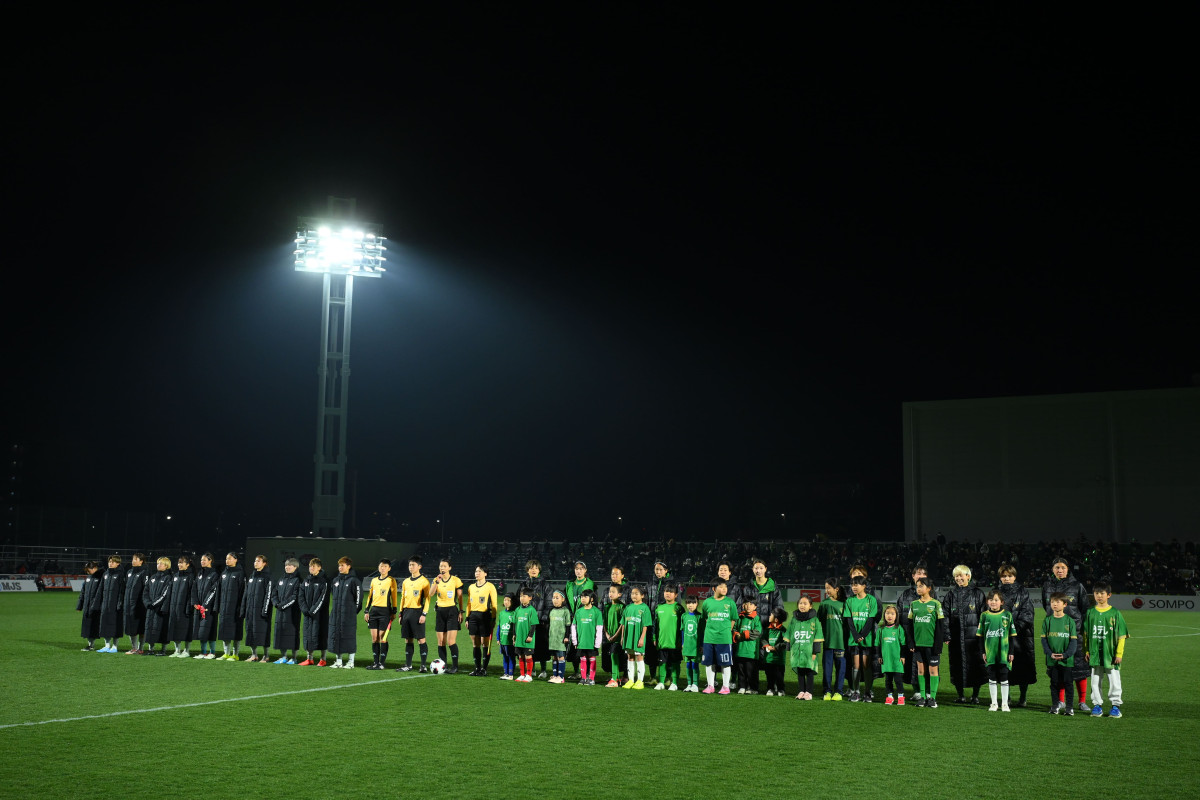 整列する両チームのイレブンとエスコートキッズ(写真提供=WEリーグ)