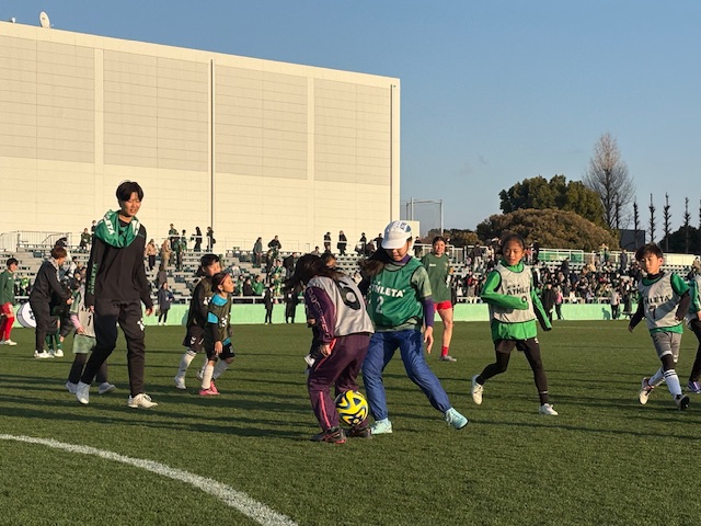 ホームゲーム恒例の「夢のピッチ体験」で、試合を終えたばかりの選手とともにプレーする子どもたち