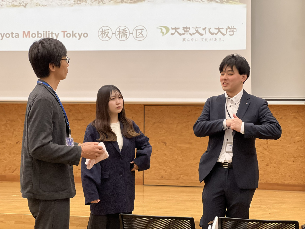 大東文化大学(板橋区高島平1)社会学部の飯塚(めしつか)裕介准教授とゼミ生が、UR都市機構、トヨタモビリティ東京、板橋区との産官学連携で進めてきた「高島平ゆめのまち産官学連携プロジェクト」の成果報告会が3月18日、同大・多目的ホールで行われた。