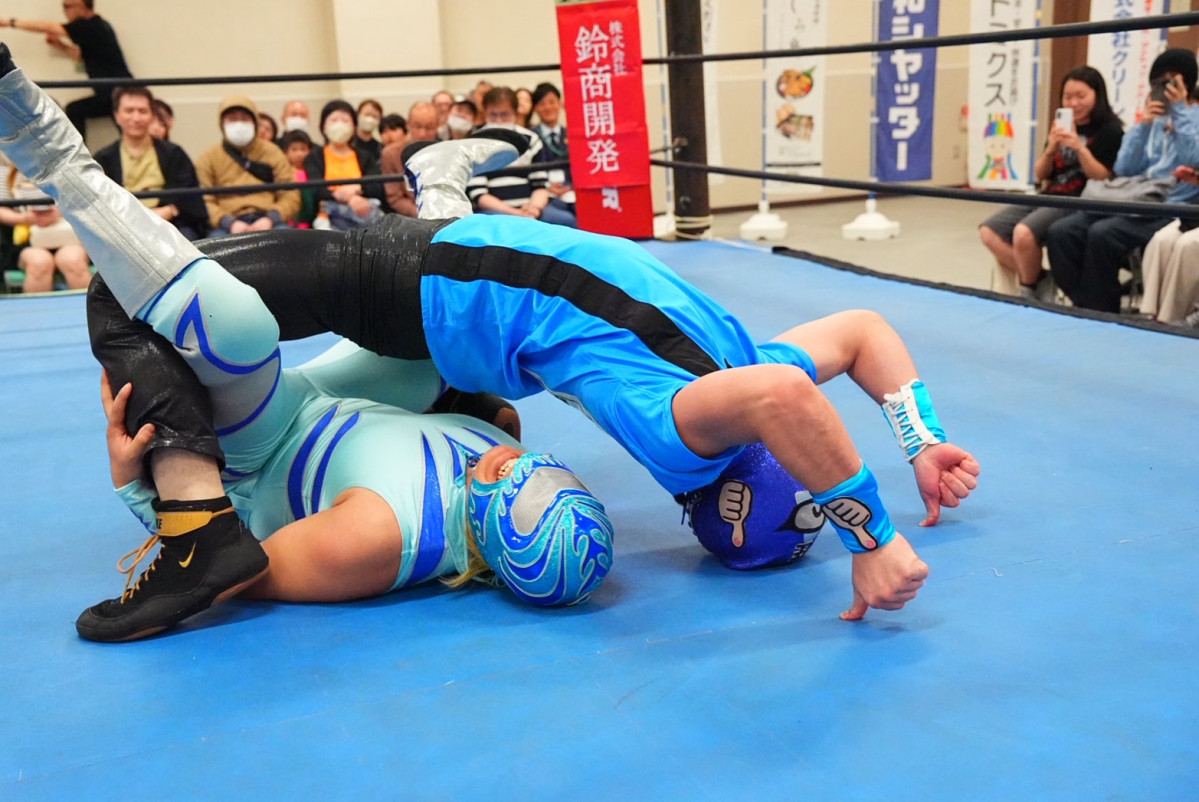 指圧マスク和がレッグロールクラッチ・ホールドを決めた(写真提供=田中幸彦)