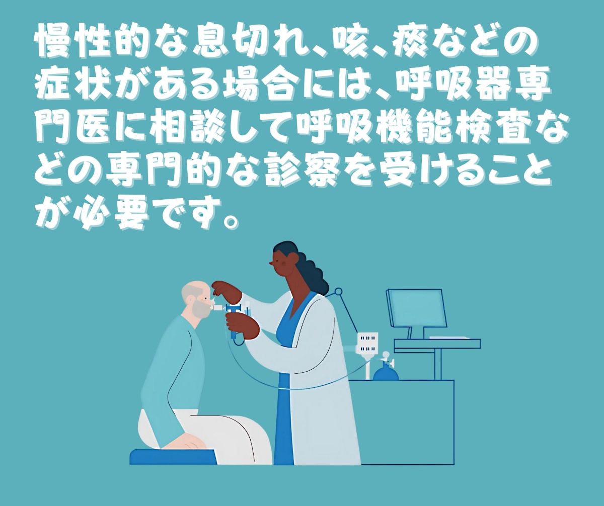 喫煙歴のある中高齢の方で、このような症状がある場合は、呼吸器専門医に相談し、肺機能検査(スパイロメトリー)を受けることが重要です。肺機能検査では,息をどれだけ吐き出せるかを測定し、COPDの診断が可能です。高齢になるほどかかりやすい病気ですので、「年のせい」と考えずに、ぜひ病院で受診しましょう。