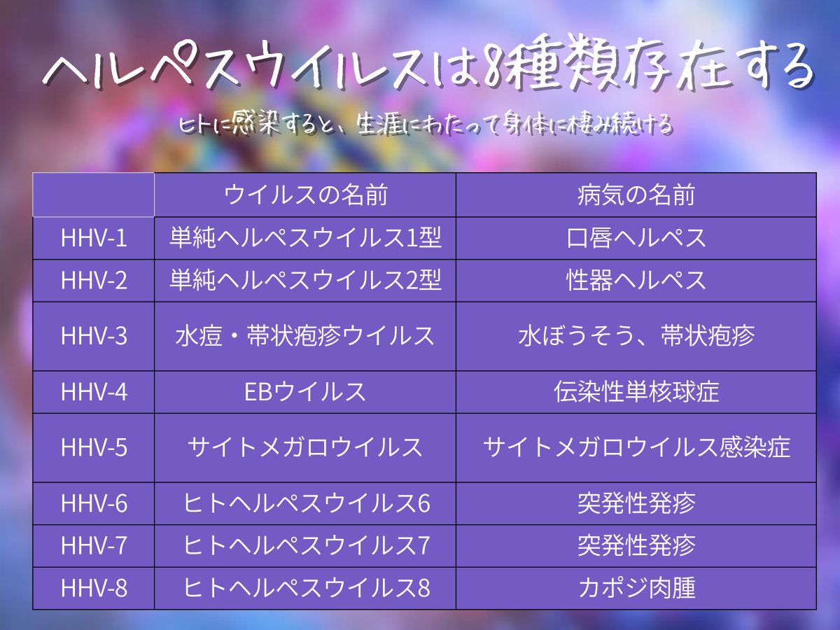 人に影響を与えるヘルペスウイルスは8種類存在します(以下、表を参照)。ヘルペスウイルスはいったん人に感染すると、生涯にわたって身体に棲(す)み続け、何らかの原因で免疫の機能が弱まった時に活動を再開して症状を引き起こします。