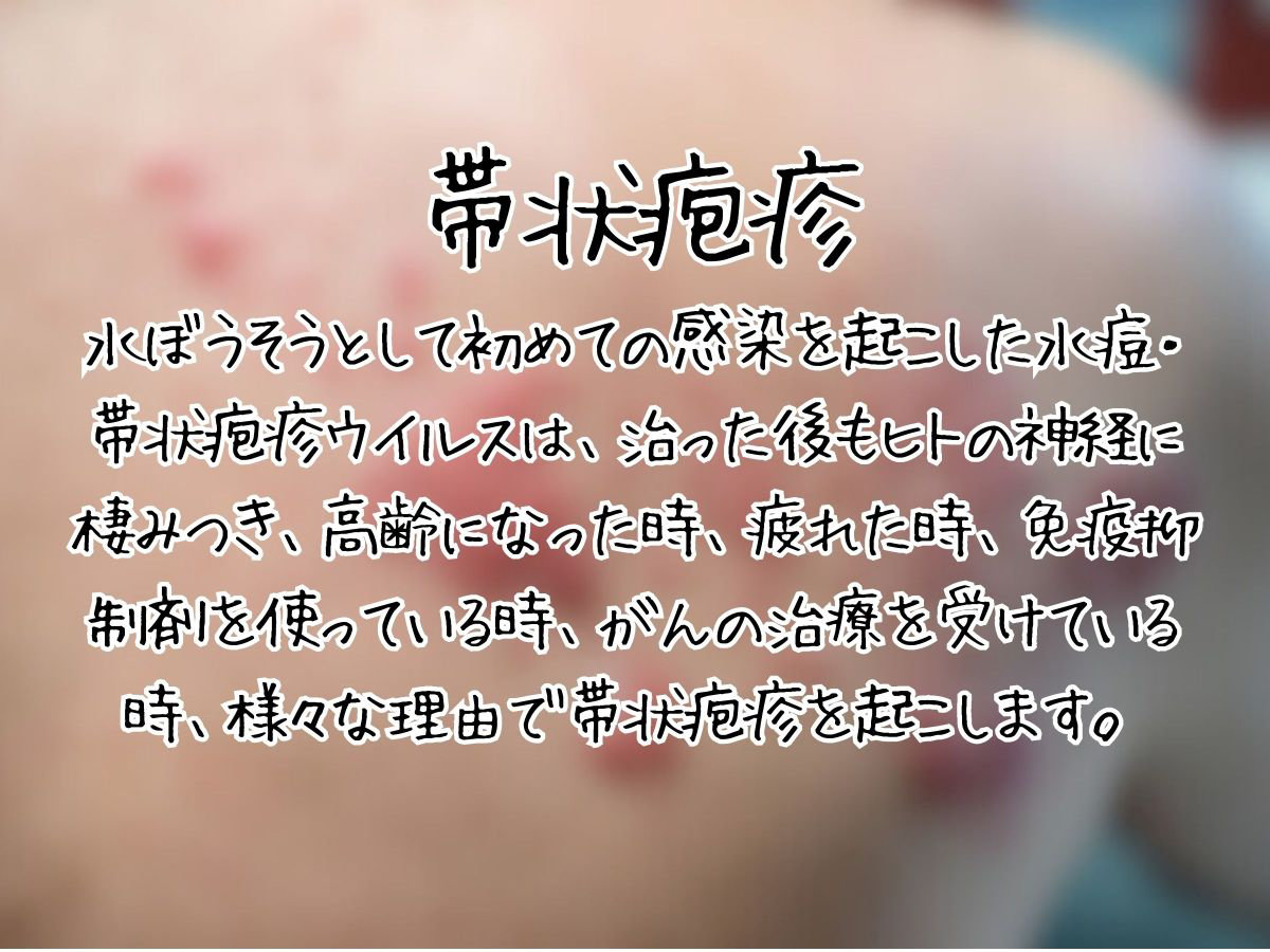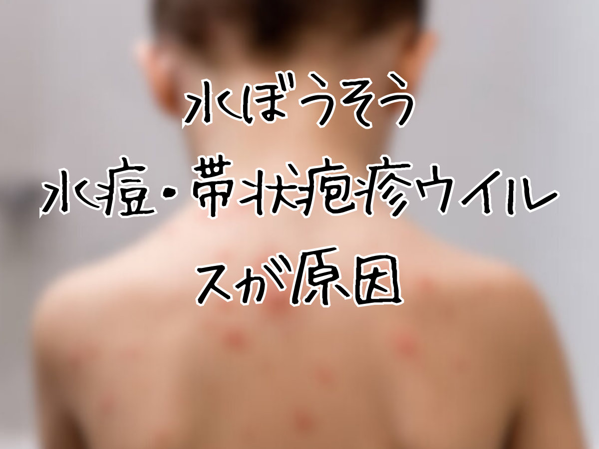 水痘・帯状疱疹ウイルスが原因となります。初めての感染は水ぼうそうとなり、倦怠(けんたい)感(だるさ)や発熱とともに全身に広がる水ぶくれを認めます。水ぼうそうは周囲の人への感染力がとても強く、医療機関に患者さんが入院された場合は個室での管理となり、このウイルスに免疫を持つ(=感染したことがあるか、水痘ワクチンを接種したことがある)医療従事者が対応することになります。お子さんでは比較的症状が軽いのですが、大人の患者さんでは症状が重くなるケースも多くあります。抗ウイルス薬の飲み薬もしくは点滴で治療します。なお、学校保健安全法の規定により、皮膚のできものが全てかさぶたになる(痂皮(かひ)化)してから登校可能となります。水ぼうそうの患者さんに接した方は、72時間以内であれば水痘ワクチン(=弱毒生ワクチン:毒性を弱めた生きたウイルス)の接種により6割から8割は発症を予防できるとされています。
