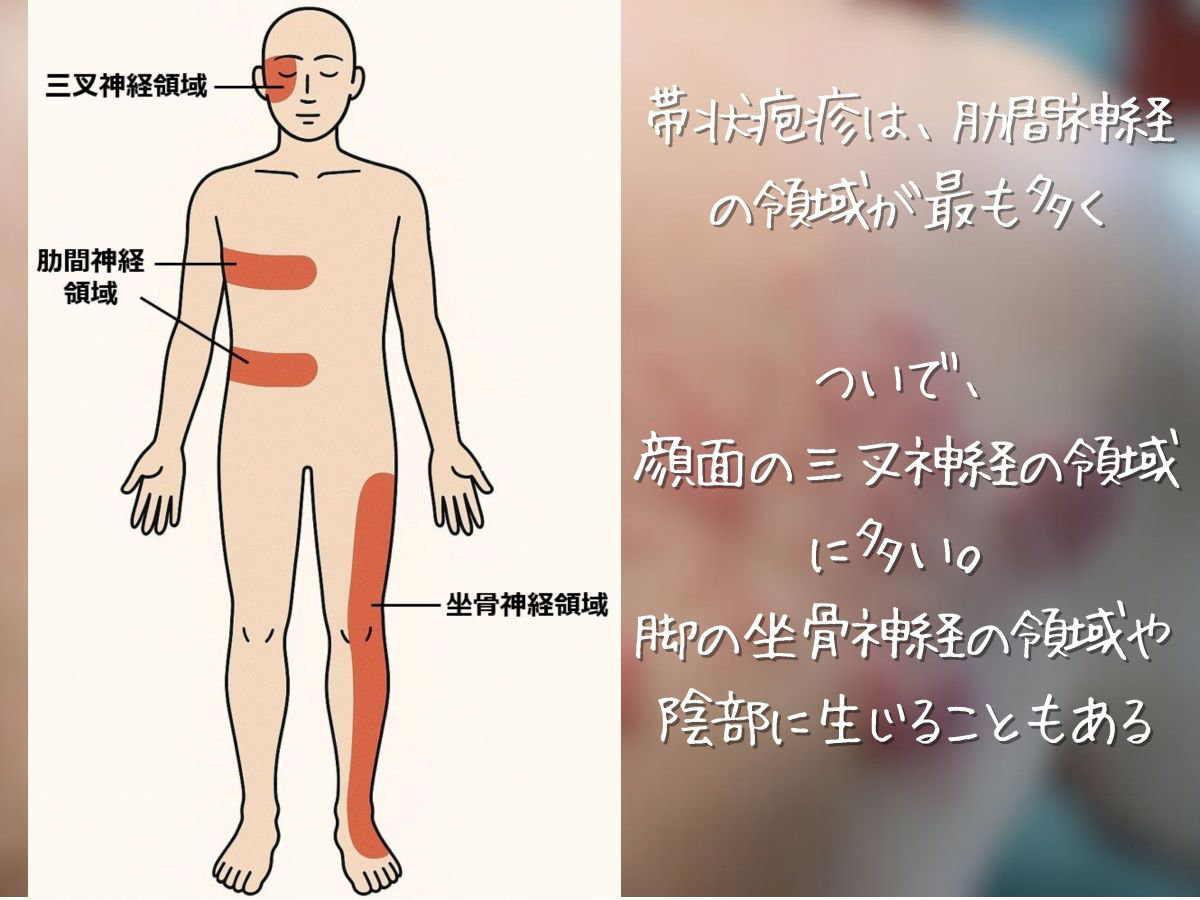 水ぼうそうとして初めての感染を起こした水痘・帯状疱疹ウイルスは、いったん治った後、人の神経に棲みつき潜んだ状態となります。高齢になった時、疲れた時、免疫抑制剤を使っている時、がんの治療を受けている時など、さまざまな理由で免疫が抑制された場合に帯状疱疹が起きます。水痘・帯状疱疹ウイルスは人の神経を好み、一定の範囲の神経に沿った形で帯状に配列するヘルペスを形成します。肋間(ろっかん)神経の領域が最も多く、ついで顔面の三叉(さんさ)神経の領域に発生しますが、脚の座骨神経の領域や陰部に生じることもあります(図)。通常は身体の片側だけに起こります。神経のところでウイルスが活動するため強い痛みを伴います。治療は水ぼうそうと同じく、抗ウイルス薬の飲み薬または点滴です。ウイルスの活動自体は1週間程度で終わるのですが、ウイルスが神経の中で激しい活動をした後ですから、病気自体は治っても神経の強い痛みが残ることがあります。これを帯状疱疹後神経痛と呼びます。3カ月以上、場合によっては年単位に及ぶ痛みの治療を必要とすることがあるため、帯状疱疹の治療における最大の課題です。また、顔の帯状疱疹は顔面神経の麻痺(まひ)、腰から臀部(でんぶ)にかけての帯状疱疹は排尿機能の障害を伴うこともあります。最近の論文では、帯状疱疹にかかった人では心筋梗塞や狭心症といった冠動脈疾患、脳出血や脳梗塞といった脳卒中の危険性が高まること、帯状疱疹発症後の30日以内では脳卒中を発症するリスクが高いことなども指摘されており、新たな視点から帯状疱疹の危険性が注目されています。