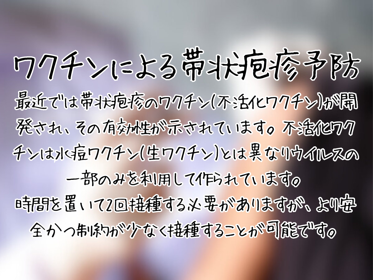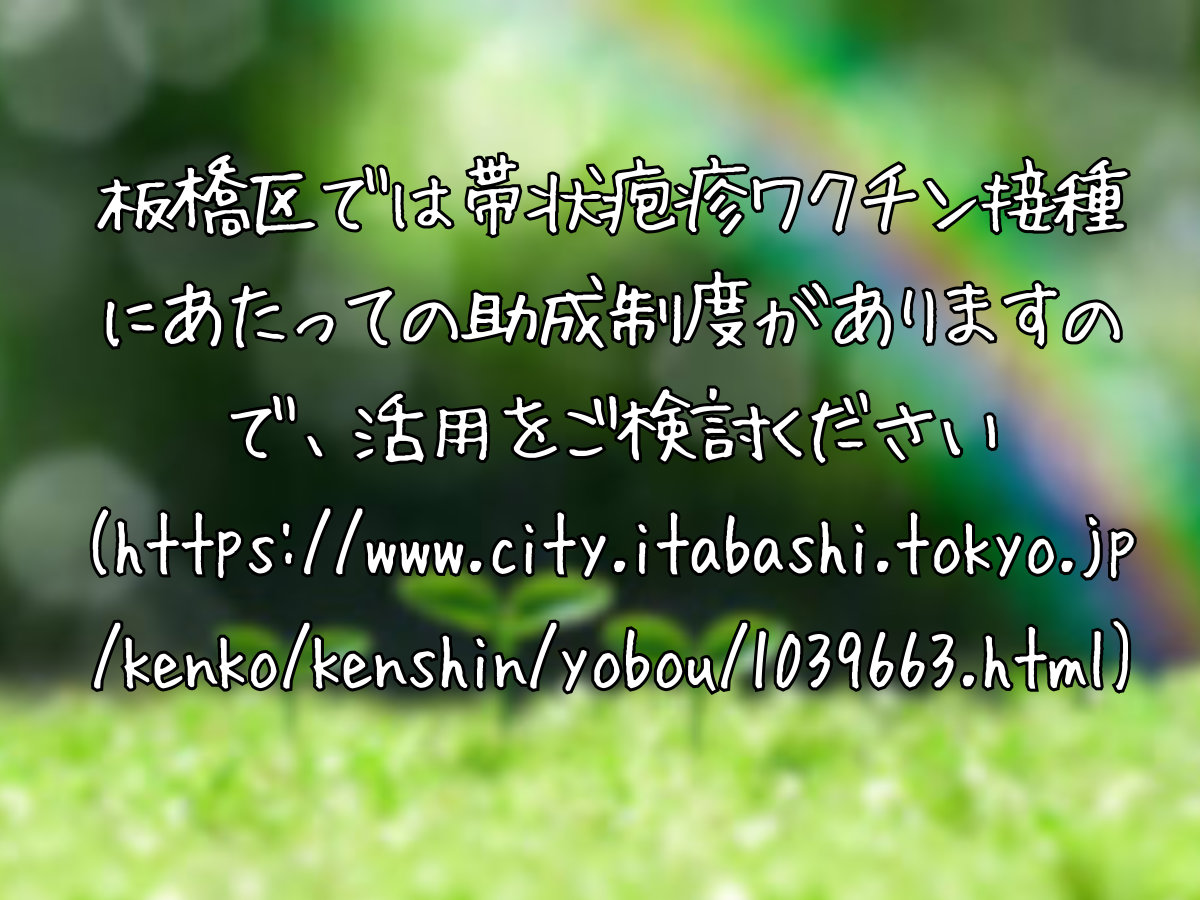 このように、帯状疱疹は長期間持続する痛みに代表されるさまざまな問題を引き起こします。最近では帯状疱疹のワクチン(不活化ワクチン)が開発され、その有効性が示されています。不活化ワクチンは前述の水痘ワクチン(生ワクチン)とは異なりウイルスの一部のみを利用して作られています。時間を置いて2回接種する必要がありますが、より安全かつ制約が少なく接種することが可能です。板橋区では帯状疱疹ワクチン接種に当たっての助成制度がありますので、活用をご検討ください。