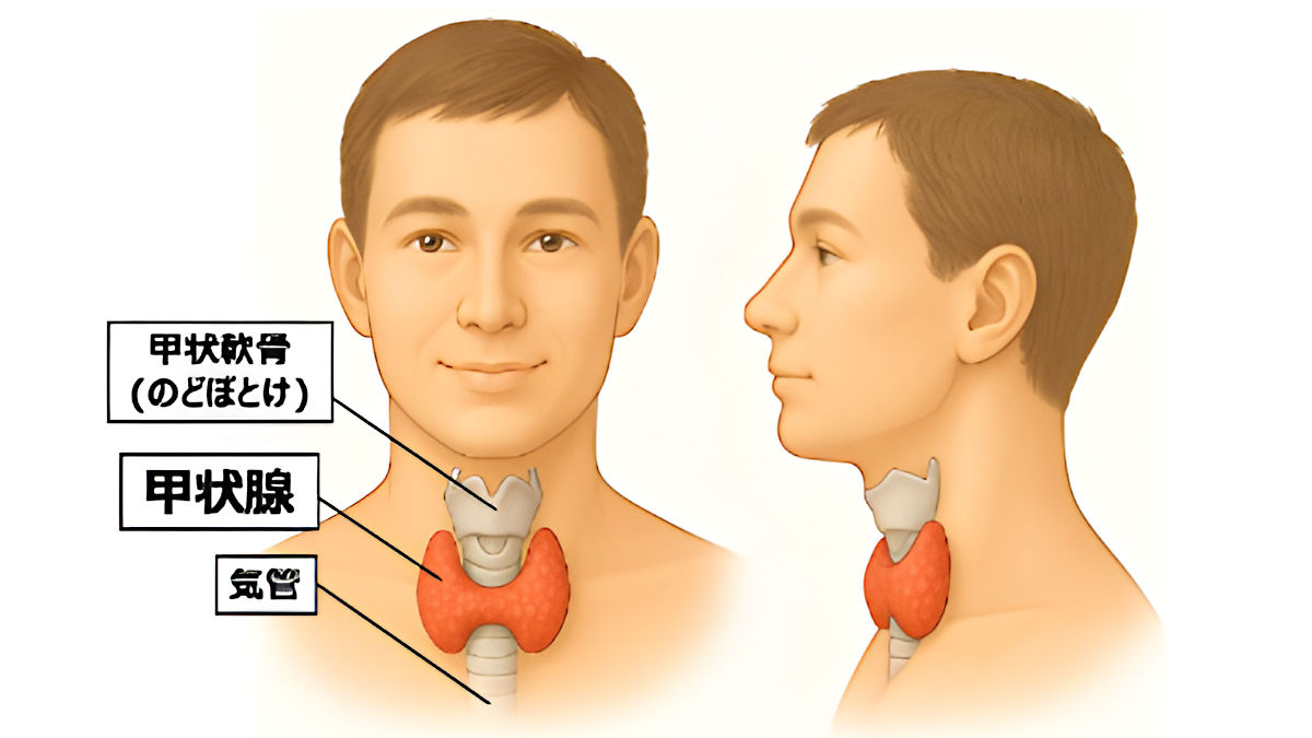 甲状腺は首の前側の、のど仏の下にある小さな臓器で、体のエネルギー代謝を調整するホルモン(T3・T4)をつくっています。甲状腺は「全身の調律役」であり、自律神経、心臓の拍動、体温、腸の動き、筋肉や精神状態、皮膚・髪のコンディションにまで影響するため、異常が起こるとさまざまな不調が全身に現れます。