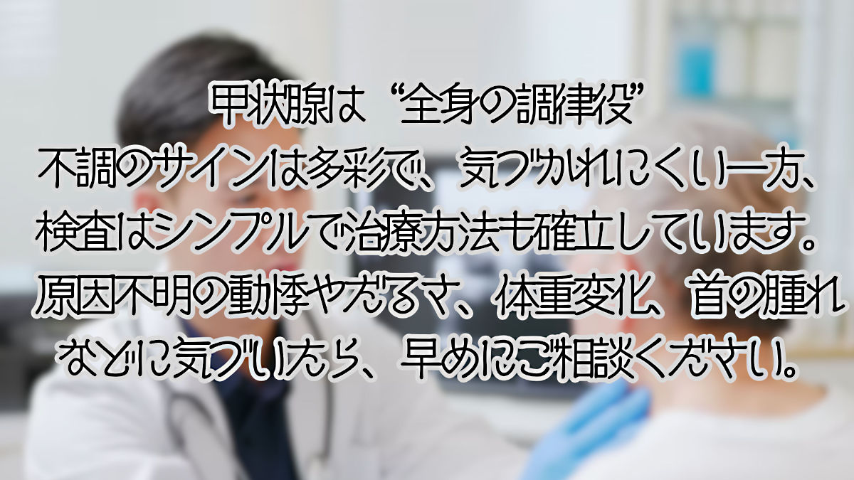 甲状腺は「全身の調律役」。不調のサインは多彩で、気づかれにくい一方、検査はシンプルで治療方法も確立しています。原因不明の動悸やだるさ、体重変化、首の腫れなどに気づいたら、早めにご相談ください。正しく診断し治療を続ければ、問題なく日常の生活を送れます。その一歩が、今日の血液検査から始まります。