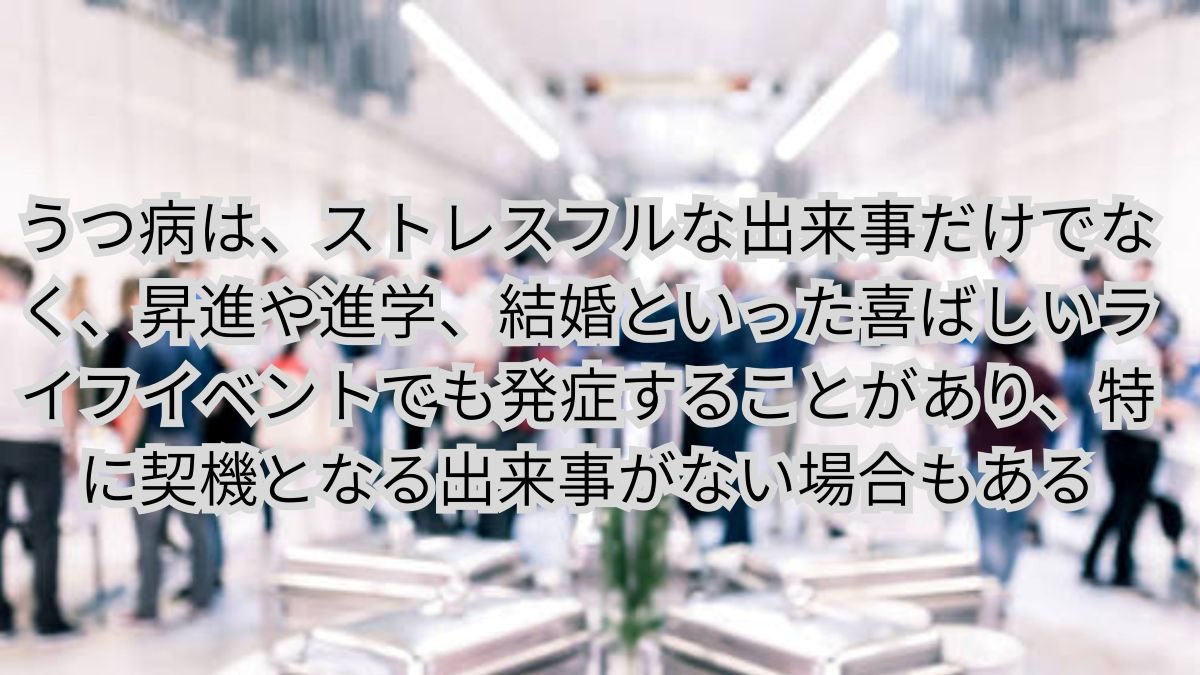ご想像の通り人生における大きな出来事がきっかけでうつ病になることはあります。配偶者との別れ、家族や自分の病気、職場の過重労働での疲労などのストレスフルな出来事です。しかし昇進や進学、結婚といった喜ばしいライフイベントでもうつ病が発症することも知られており、さらには特に契機となる出来事がない場合もあるのです。