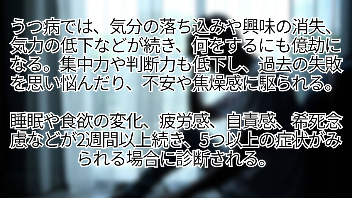 うつ病の精神症状にはさまざまな症状があります。気分が落ち込み、憂鬱な気分になったり、これまで好きだったことへの興味や喜びがなくなったりします。また、気力が低下して何をするにもおっくうになる、集中力がなくなり能率が低下する、物事の判断ができなくなるといった症状も見られます。過去の失敗を思い悩んだり、どこか体に異常があるのではないかという強い不安感や落ち着きなく動き回ったりするといった焦燥感が見られることもあります。うつ病の精神医学的な診断には、同じ2週間の間に5つ以上の症状があるかを確認します。抑うつ気分、興味や喜びの消失は主要症状で、そのほか睡眠(過眠・不眠)、食欲(増減)、疲労感、集中困難、自責感や希死念慮(ねんりょ)などの症状も評価します。また他の身体疾患や薬剤によるうつ状態を除外することも必要です。