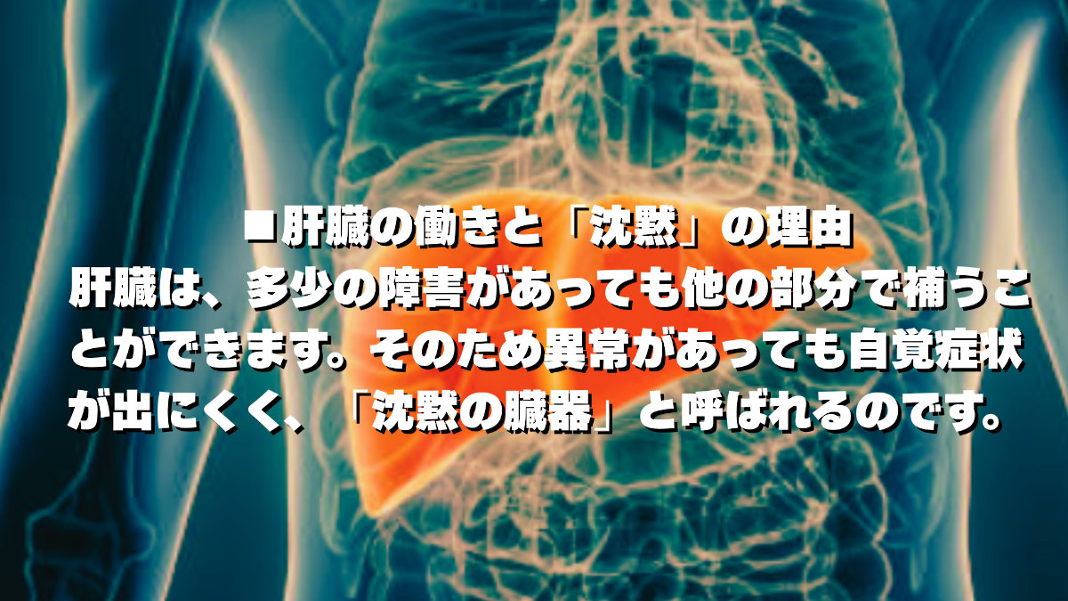 このように多くの機能を持つため、多少の障害があっても他の部分で補うことができます。そのため異常があっても自覚症状が出にくく、「沈黙の臓器」と呼ばれるのです。