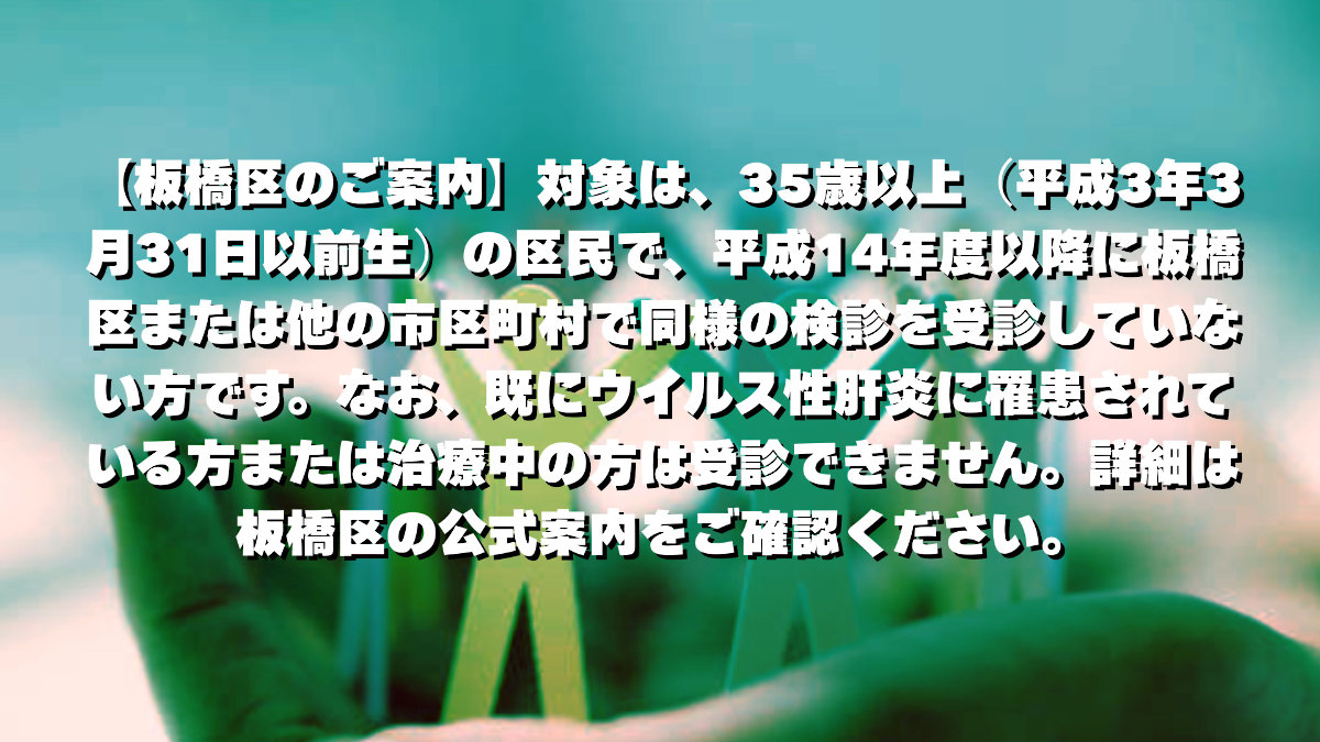 対象は35歳以上(平成3年3月31日以前生まれ)の区民で、平成14年度以降に板橋区または他の市区町村で同様の検診を受診していない方です。既にウイルス性肝炎に罹患(りかん)されている方や治療中の方は受診できません。詳細は板橋区の公式案内でご確認ください。